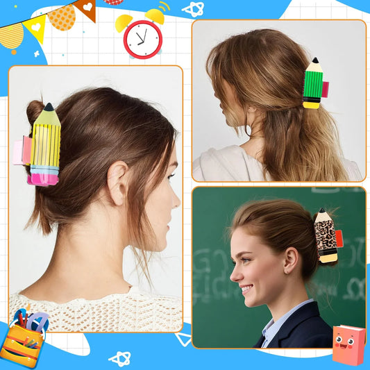 4Pcs Pencil Hair Clips Back To School Hair Accessories For Women Sunflower Leopard Stripe Hair Claw Clips Non Slip Hairpin For Thick Thin Hair School Opens Season Teachers Outfit Decor Clearance
