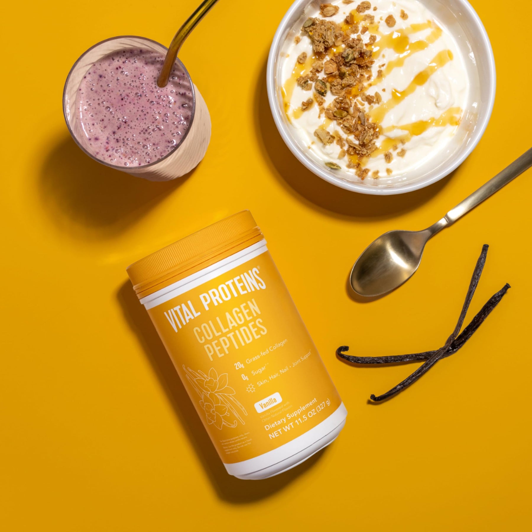 • 0g Sugar^^ ---- Made with natural vanilla flavor and a touch of stevia, Vanilla Collagen Peptides contains 0g of sugar.^^