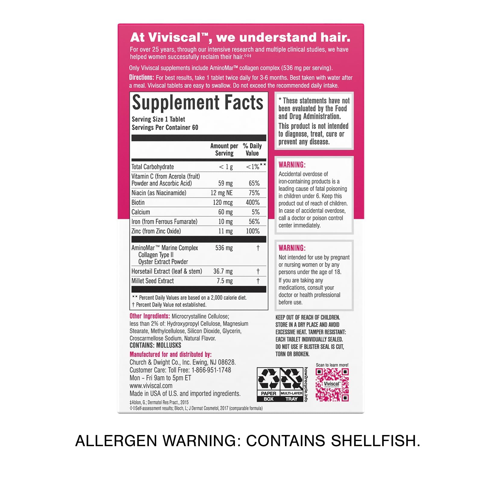 Viviscal Hair Growth Supplements for Women, Dietary Hair Supplement Tablets With AminoMar Collagen Complex, Biotin, Zinc, Vitamin C, and Iron, Nourish Thinning Hair, 30 Day Supply, 60 Count